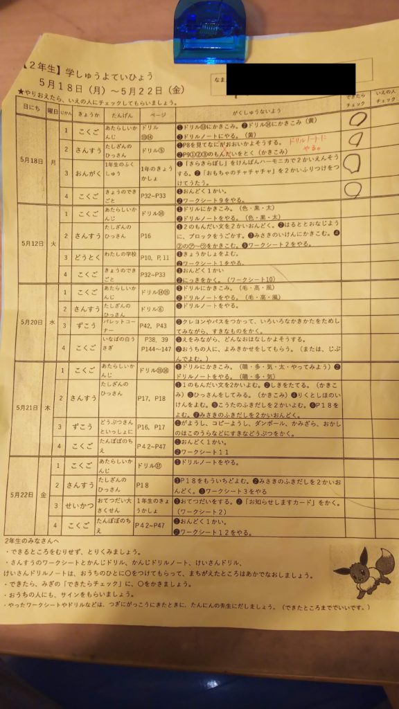 緊急事態宣言の延長と共に、コロナ休み期間も延長となり、グナ兄もGW明けに小学校に追加の課題をもらいに行きました。追加の課題をもらって二週間、グナ家も多少の落ち着きが出てきましたので、状況をまとめます。
