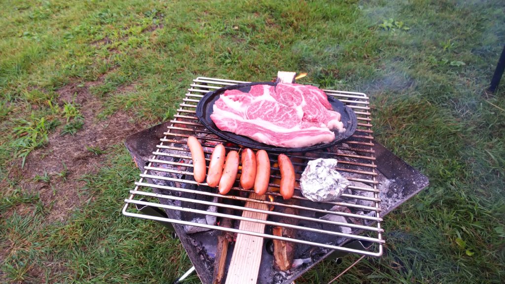 そんな苦労しているこれまでのキャンプ飯を簡単に紹介します。実家で使っていた鉄板をもってきて、ステーキ肉の鉄板焼き。家では油が飛んだりするので、屋外でしか使っていません。最近は、ファイアグリルに元からついていた網ではなく、ヘビーロストルを使用しています。これなら鉄板も使えるし、網同様に焼肉するのも問題なし。鍋料理も可能になります(やったことないけど)。