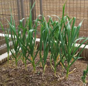 ミニトマトの収穫後は、ニンニクに挑戦しました。秋ごろニンニクを植え付け冬を越させます。下の写真は冬を越して春になり、葉が生い茂ってきた頃です。