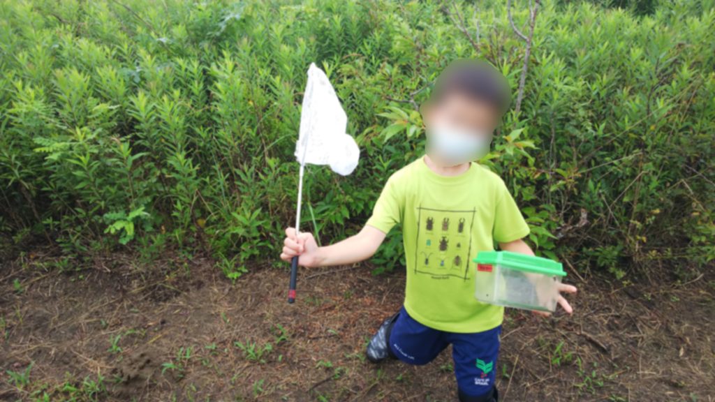 テントサイトに着くなり、グナ兄はずっと虫取りしてました。テント設営時も、あたりをバッタ探してウロチョロ、ウロチョロ。気づくとかなり遠くまで移動しているので、ヒヤッとします。今回のキャンプサイトは、周辺に危険な崖や川はなかったのですが、場所によっては彼の行動に目を光らせる必要があります。