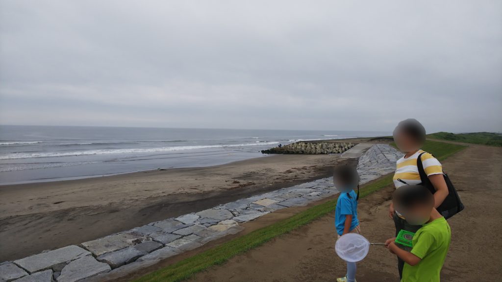 テントの設営が完了すると、早速海に出かけてみます。このサイトを選んだ一番の理由は海!歩いて3分ほどで、九十九里浜に出ることができます。遊泳禁止区域のため、泳ぐことはできませんが、貝殻拾いや砂遊び、浜の生き物観察には十分です。