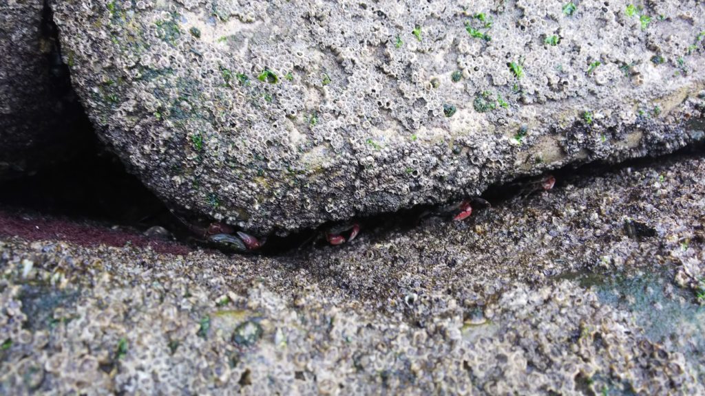 捕まえようと、必死に木の枝を突っ込んだりしましたが、臆病なカニたちは一向に隙間から出てきてくれません。結局、貝殻と貝の幼生??みたいなやつ、海藻、ヒトデの仲間?みたいな生き物たちを採取してテントで一夜を過ごしました。グナ妹は、持って帰りたそうでしたが、海水は勘弁ということで、翌朝お別れしています。