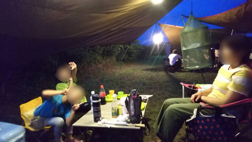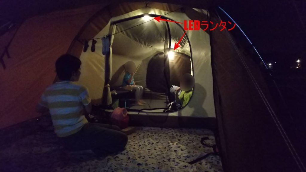 上の写真のLEDランタンも今回新規購入品です。テント内の明かりや、食事中のテーブル上の明かりは、100均ロープと組み合わせてバッチリでした。amazonのタイムセールで割引もあったりで、かなりお買い得でした。