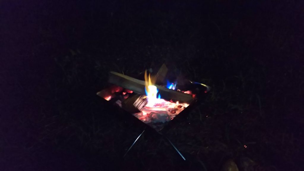上の写真は、今回の焚き火の様子ですが、分かりますか?青い炎が出ています。これ、お隣に来ていた先輩キャンパーさんがくれた焚き火グッズなんです。こんなグッズもあるんですね。炎色反応??子供たちは大興奮でした。