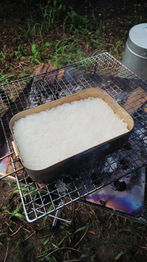 朝は今大ブームのメスティンでの炊飯に挑戦しています。案外簡単にふっくらご飯が炊きあがりました。家族4人分なので、1Lのメスティンで1.5合炊飯しました。グツグツいいだしてたら一旦蓋を開けて中を掻き混ぜます。またグツグツいいだしたら、直火から避難して約10分。さらに離して10分蒸らして完成です。