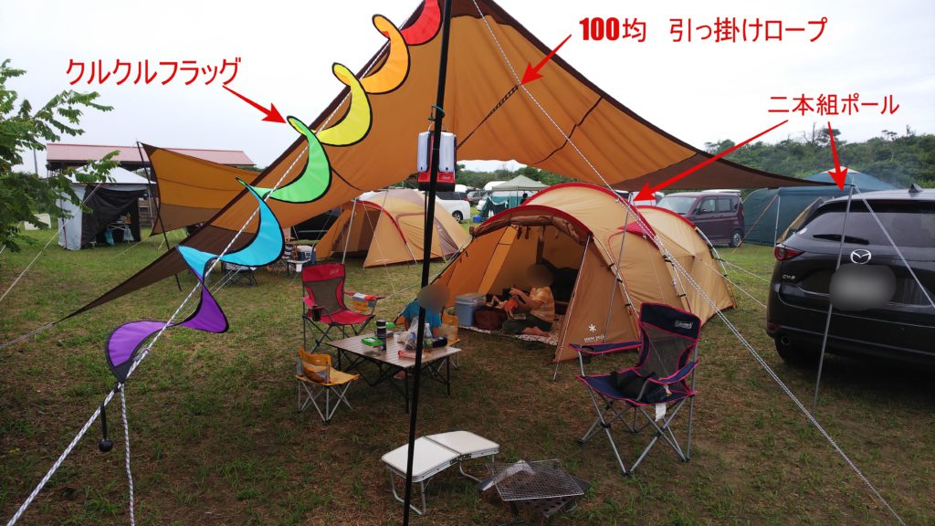 クルクルフラッグは、初キャンプの際にお隣さんが飾っていたもの。一気にサイトの雰囲気が変わってきます。イマドキな感じ。グナ妹がすごく喜んでくれます。