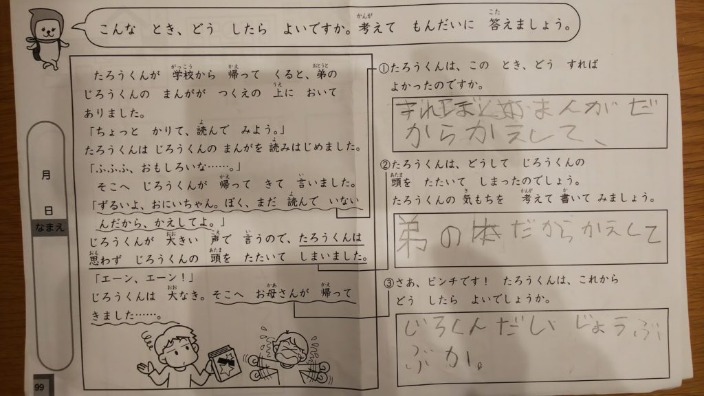 このプリントを見ていると、グナ兄が最もついていけない授業は、道徳の時間なんだろうなぁと想像しています。